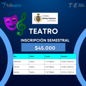 El Taller de Teatro del Colegio Divina Pastora La Florida está dirigido a estudiantes de 1° a 8° básico, y de I° a IV° Medio, ofreciendo un espacio creativo donde la imaginación, la expresión y la confianza se desarrollan de manera natural y formativa 🎬.