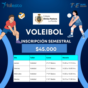 El Taller de Voleibol del Colegio Divina Pastora La Florida está dirigido a estudiantes de 3° básico a 8° Básico y de 1° a 4° medio, ofreciendo un espacio deportivo formativo donde la técnica, la estrategia y el trabajo en equipo se desarrollan con disciplina y compromiso 💪.