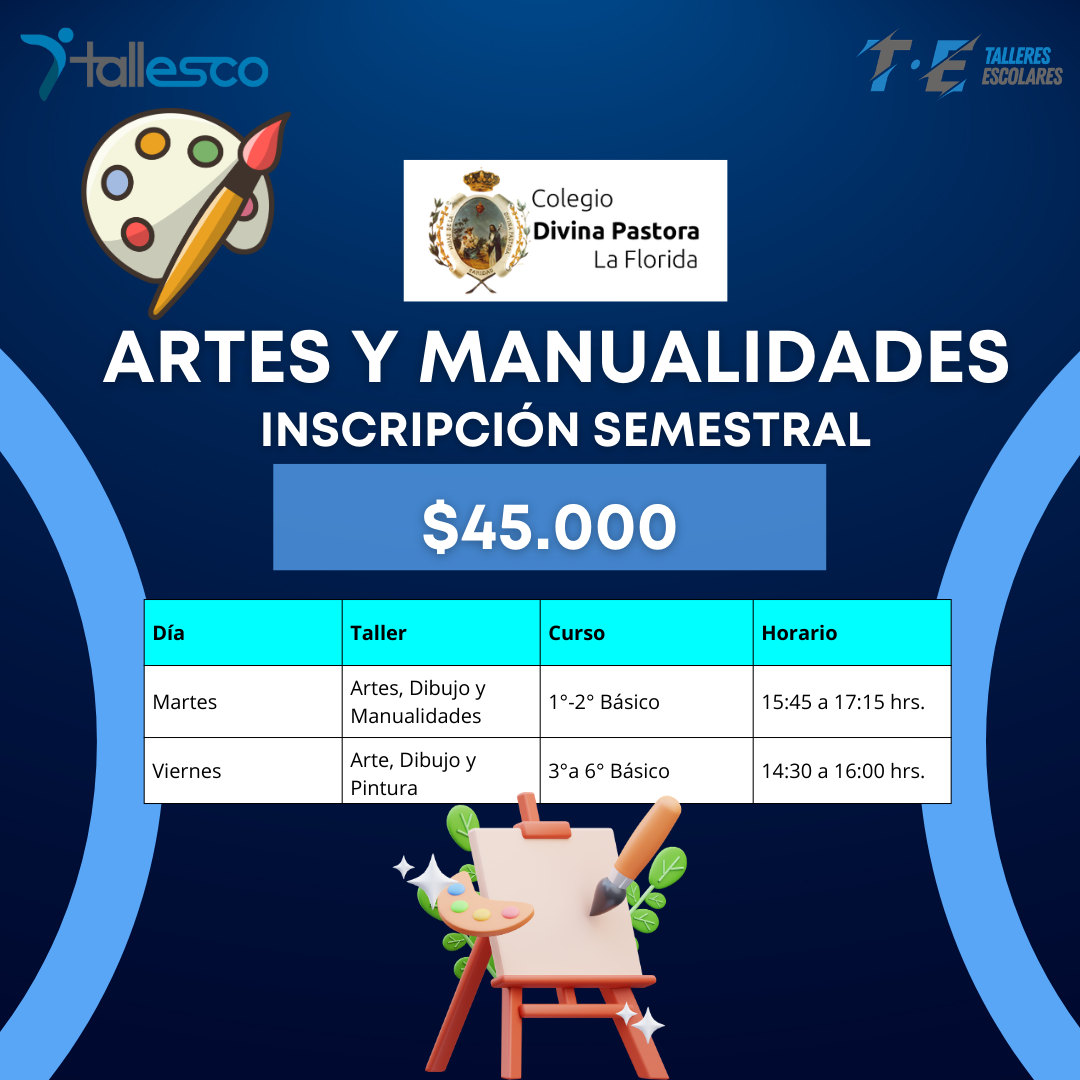 Los talleres de Artes, Dibujo y Pintura del Colegio Divina Pastora La Florida invitan a niñas y niños desde 1° a 6° básico a explorar su creatividad, expresarse libremente y disfrutar del arte en un ambiente cercano y estimulante ✂️🖍️🎨.