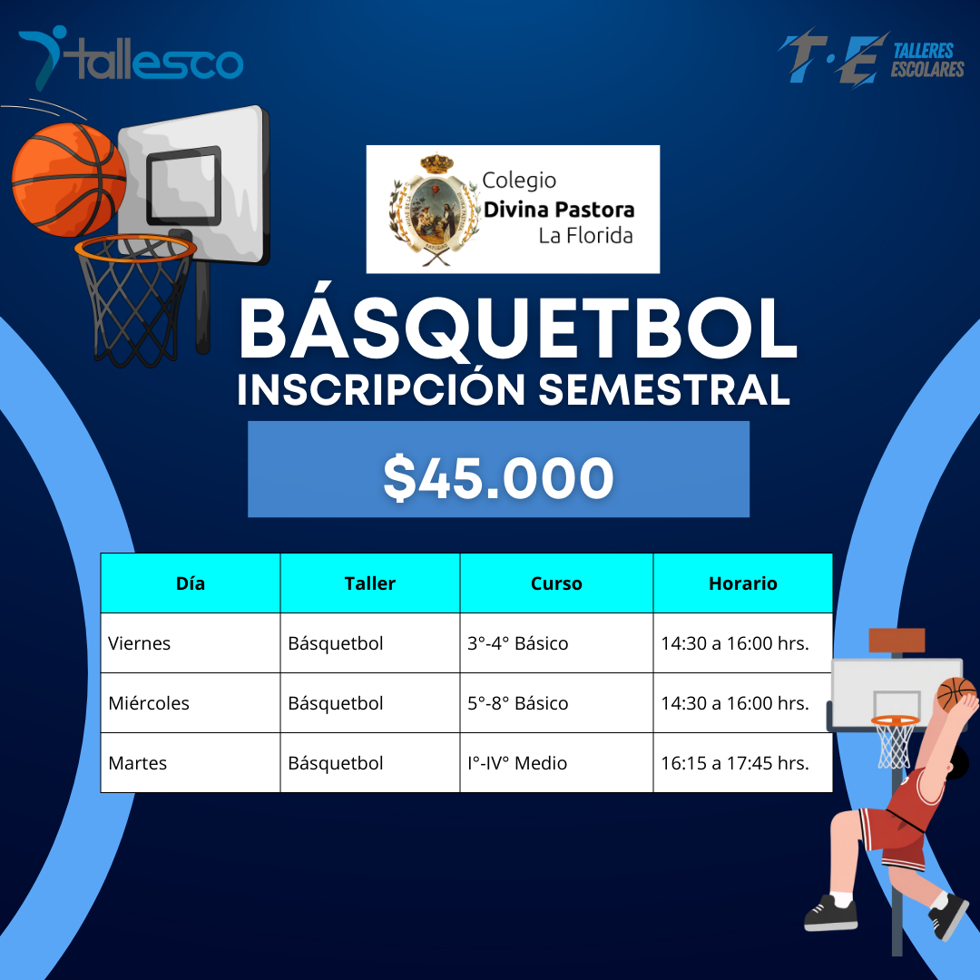 El Taller de Básquetbol del Colegio Divina Pastora La Florida está dirigido a estudiantes en modalidad mixta, ofreciendo un espacio formativo, dinámico y motivador para aprender y disfrutar este deporte 🏀✨.