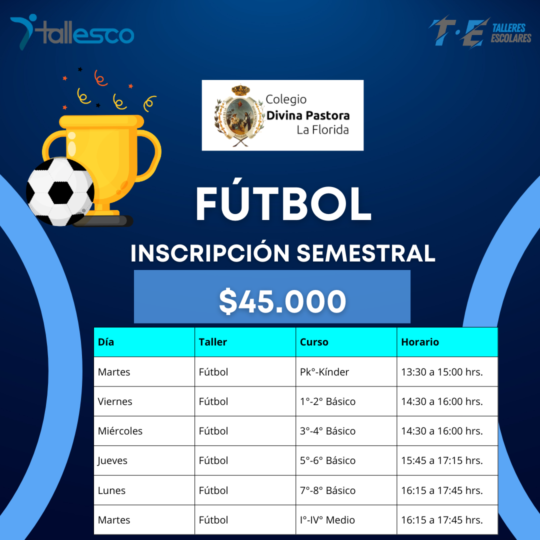 El Taller de Fútbol del Colegio Divina Pastora La Florida está dirigido a estudiantes desde Prekínder hasta IV° Medio, ofreciendo un espacio formativo integral donde el deporte se convierte en una escuela de carácter, disciplina y trabajo en equipo 🏃‍♂️⚽.