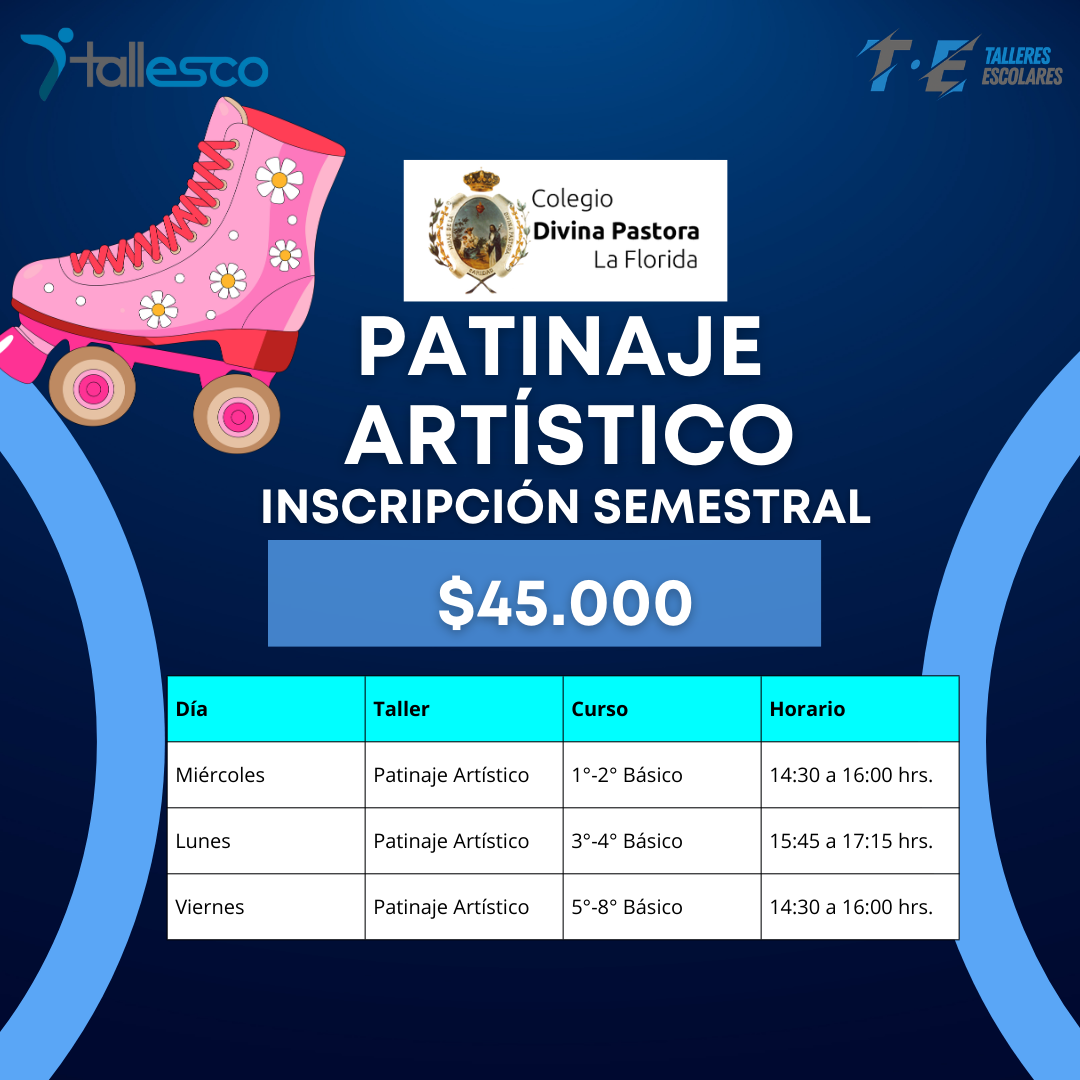El Taller de Patinaje Artístico del Colegio Divina Pastora La Florida está dirigido a estudiantes de 1° a 8° básico, ofreciendo un espacio formativo donde el equilibrio, la elegancia y la disciplina se desarrollan sobre ruedas 💫.
