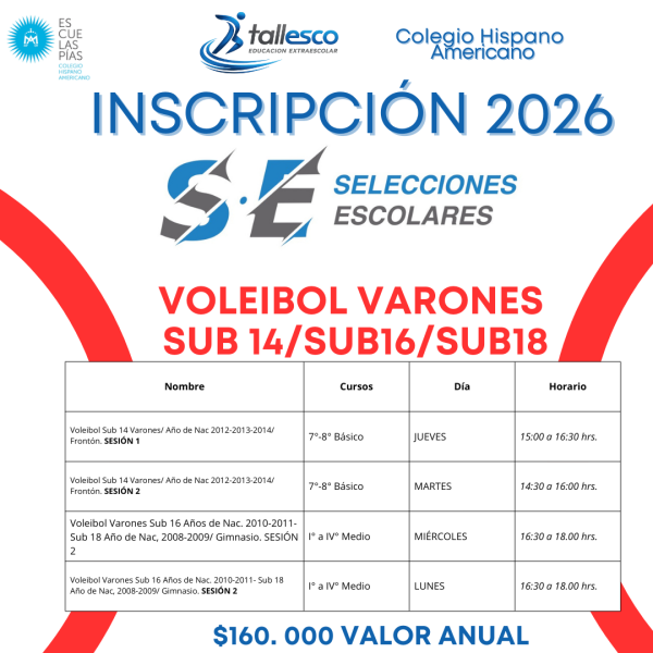 | Voleibol Varones Sub 16 Años de Nac. 2010-2011- Sub 18 Año de Nac, 2008-2009/ Gimnasio. SESIÓN 2 | I° a IV° Medio | LUNES | 16:30 a 18.00 hrs. |